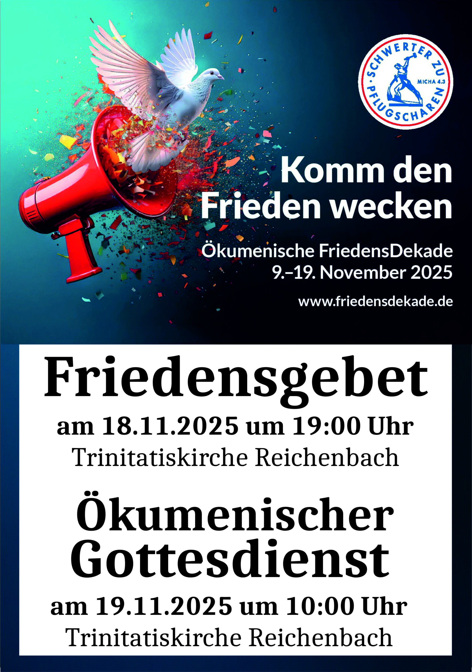 Die in der Reichenbacher Ökumene verbundenen Gemeinden laden herzlich zu 2 Veranstaltungen im Rahmen der Ökumenischen FriedensDekade in die Trinitatiskirche ein: