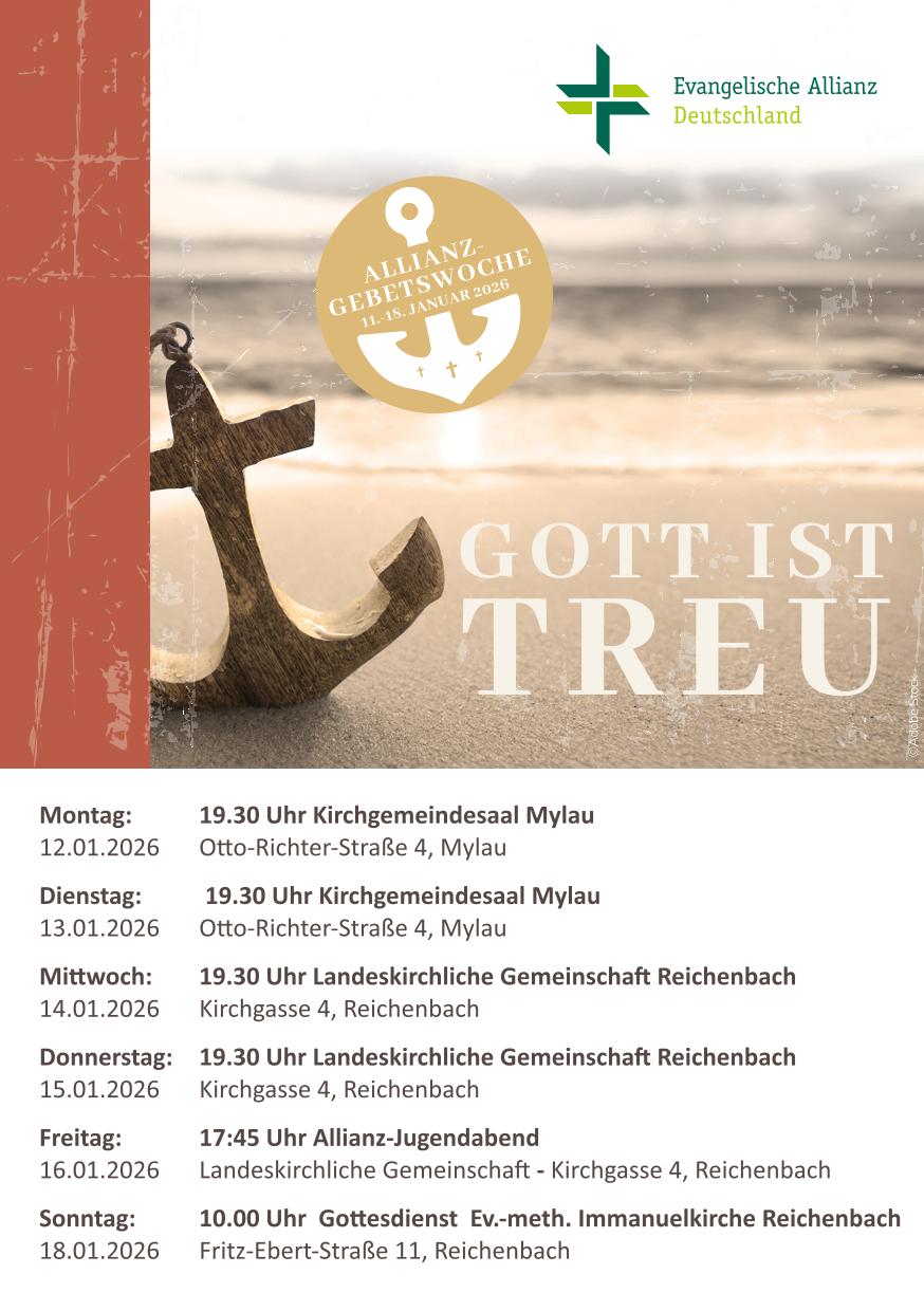 Die in der Ökumene verbundenen Gemeinden in Reichenbach laden herzlich zur Allianz-Gebetswoche 2026 vom 11.-18. Januar ein. Das Thema lautet: „Gott ist treu“